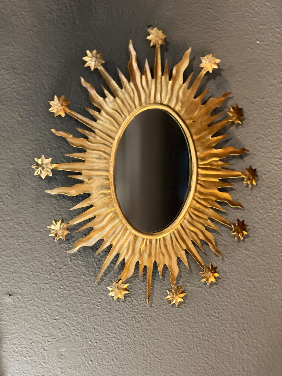 Specchio dorato in metallo e cristalli, corona con sole e stelle